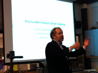 Joensuun normaalikoulun rehtori Heikki Happonen johdattelee Uimaharjun ja Nepenmäen koulujen opettajia Muuttuva oppimaisema -tulevaisuuden koulun horisontti prosessikoulutukseen. Tänään ensimmäinen kuuden tunnin sessio Metodimessujen yhteydessä.